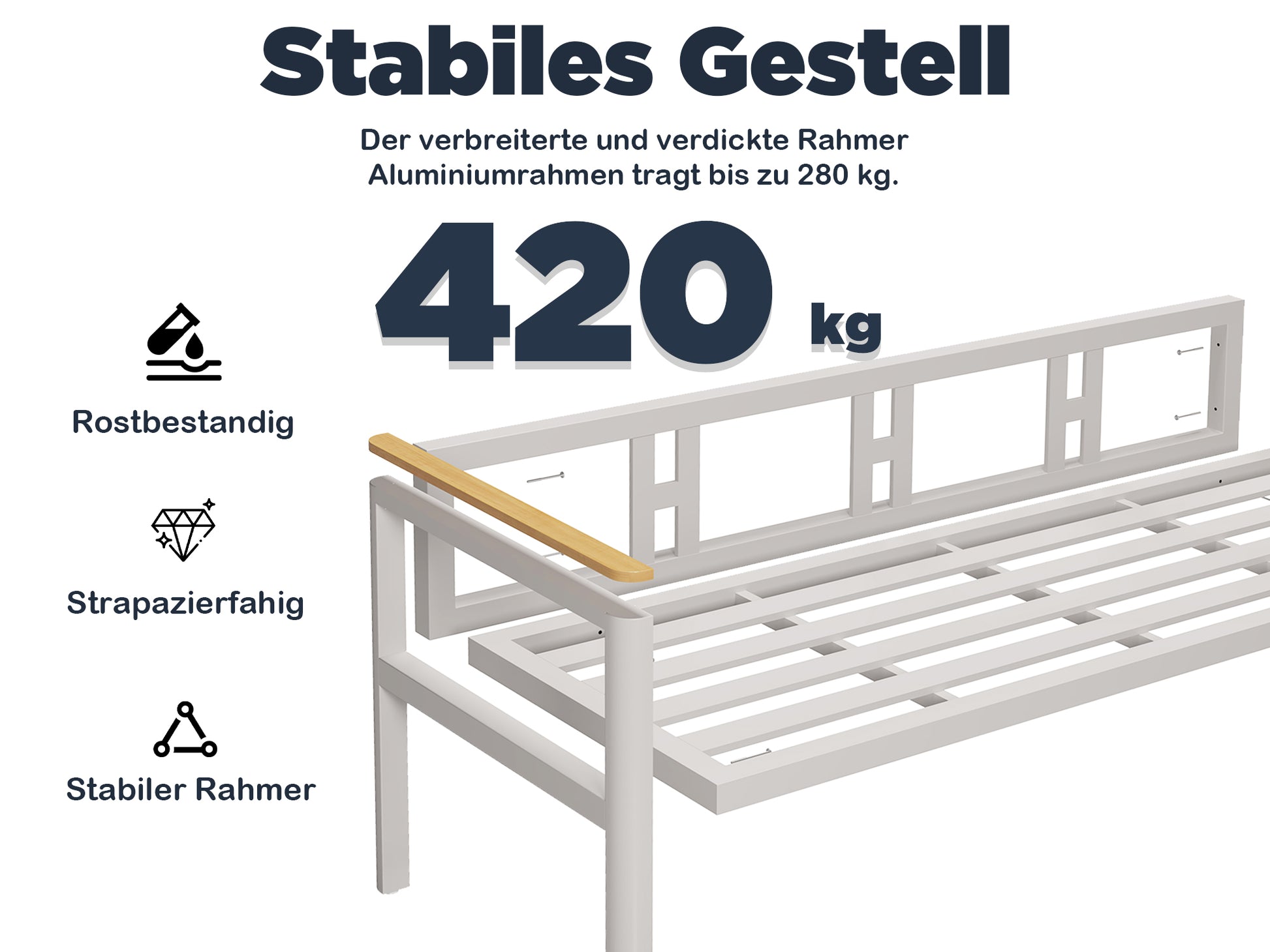 - Wetterfest: Der Aluminiumrahmen ist rost- und korrosionsbeständig, der Outdoor-Stoff ist schmutzabweisend und schnell trocknend – formstabil auch bei langer Nutzung.